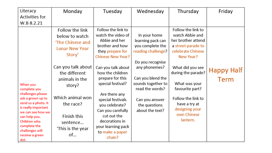 This week we are learning all about the festival of Chinese New Year. Click on the link below to access the videos.