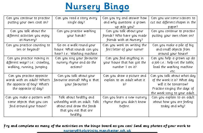Each morning we will be putting some activities online, on our school nursery page for you to get busy with, as well as a ‘Nursery Bingo’ challenge grid. Let’s see if you can complete all of the activities and the challenges on the bingo grid, by the time we next get to see each other.
