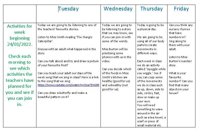 On Friday your child will bring home a new sharing book in their reading bag. This is for you to enjoy with your child by looking at the pictures and talking about the rhyming words that they can hear. This links to our Phase 1 Phonics scheme that we teach in school each day. Please ensure your child returns this book every Wednesday.