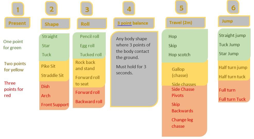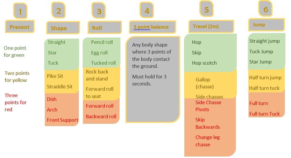 Today we are going to be continuing our gymnastics. We are going to prepare for our gymnastics competition we will have when we return to school. I would like you to select one movement from each section on the list in the picture. That means you should complete:
