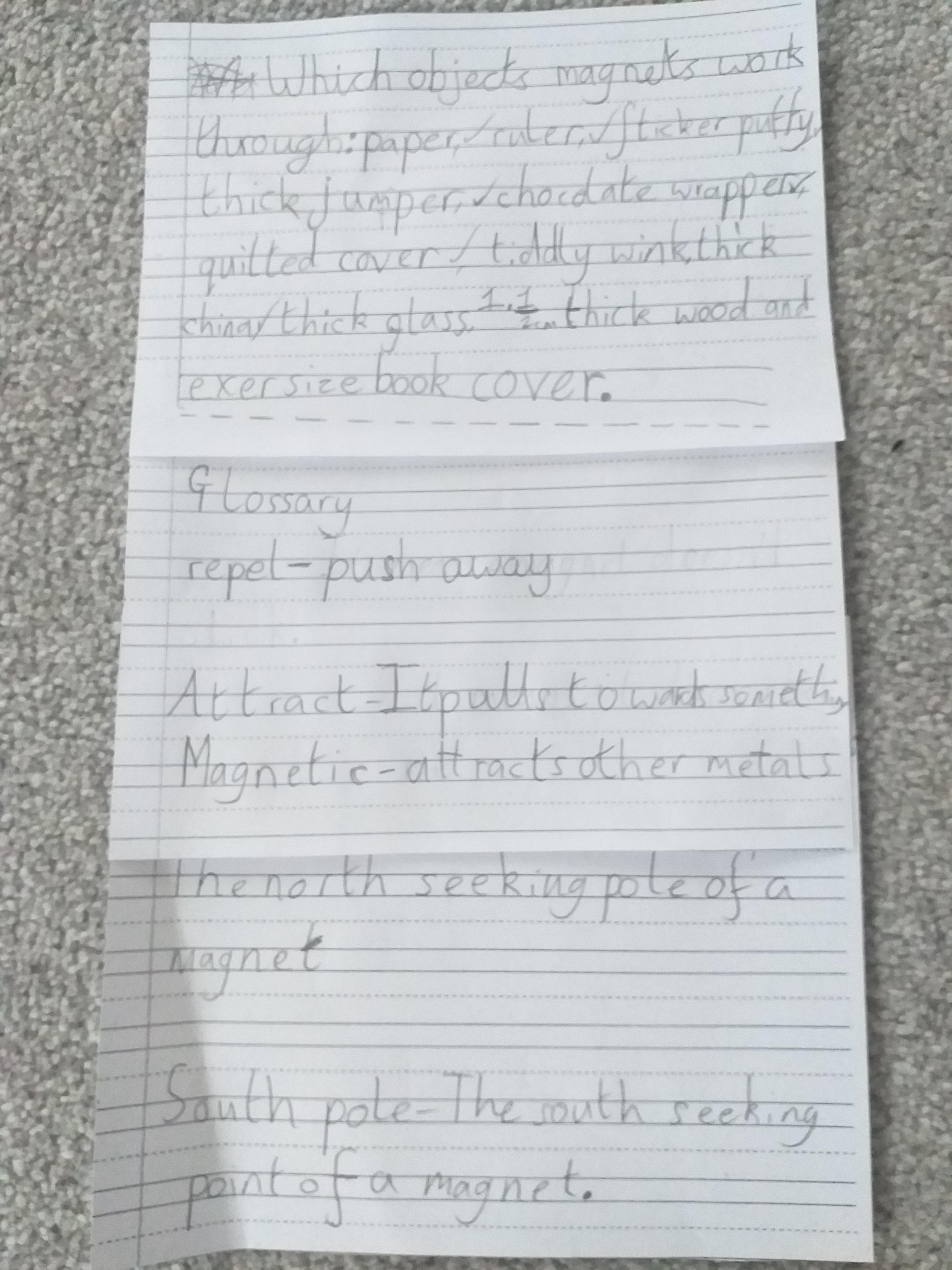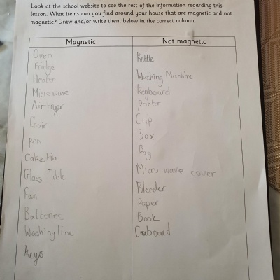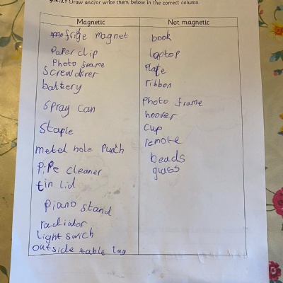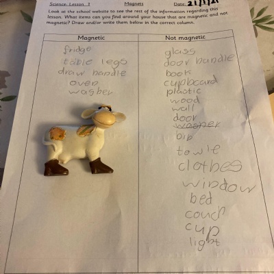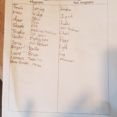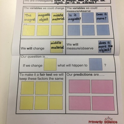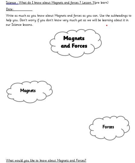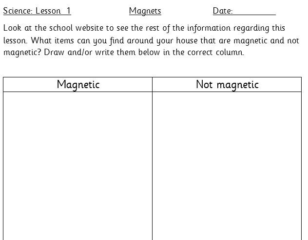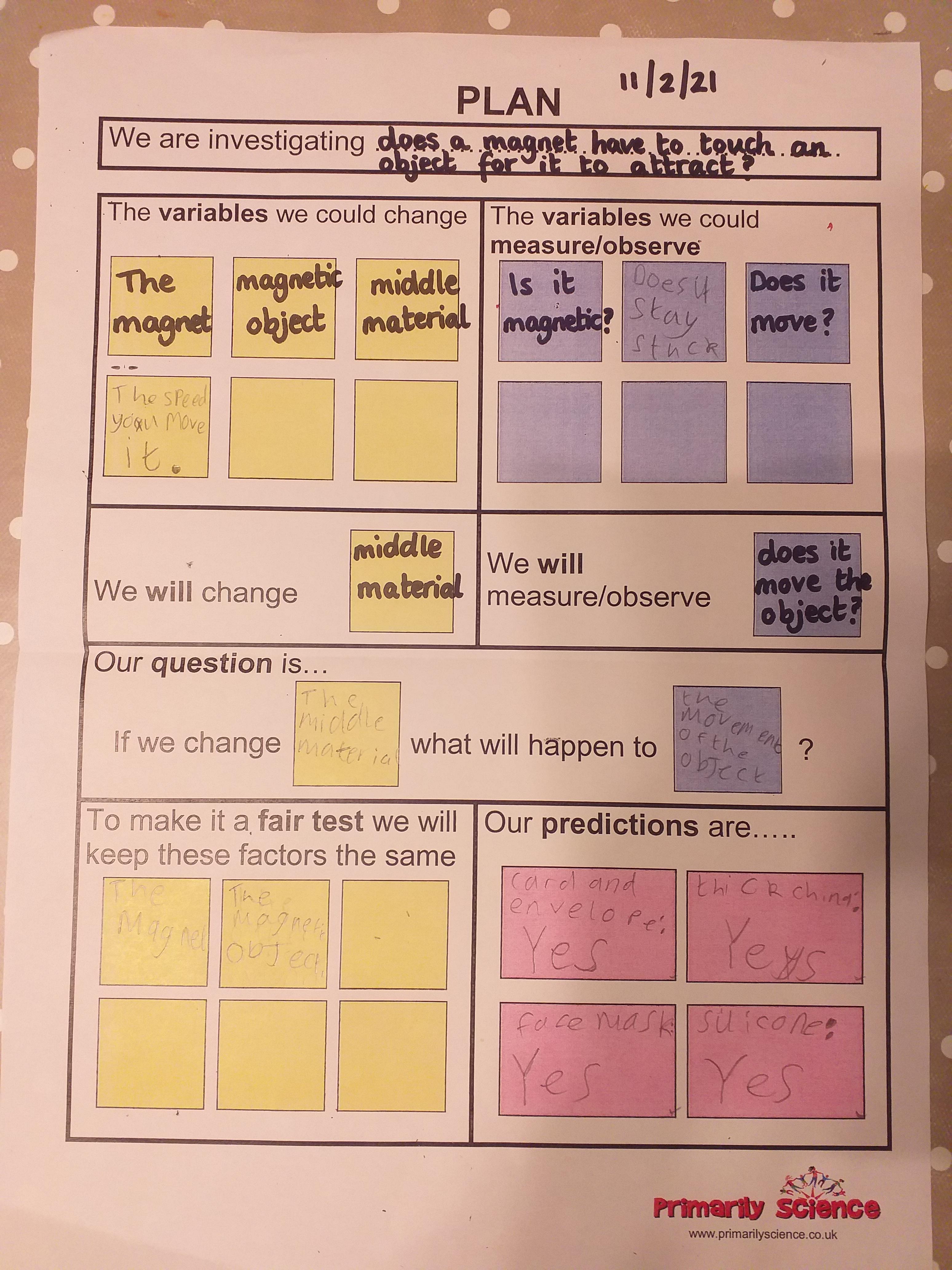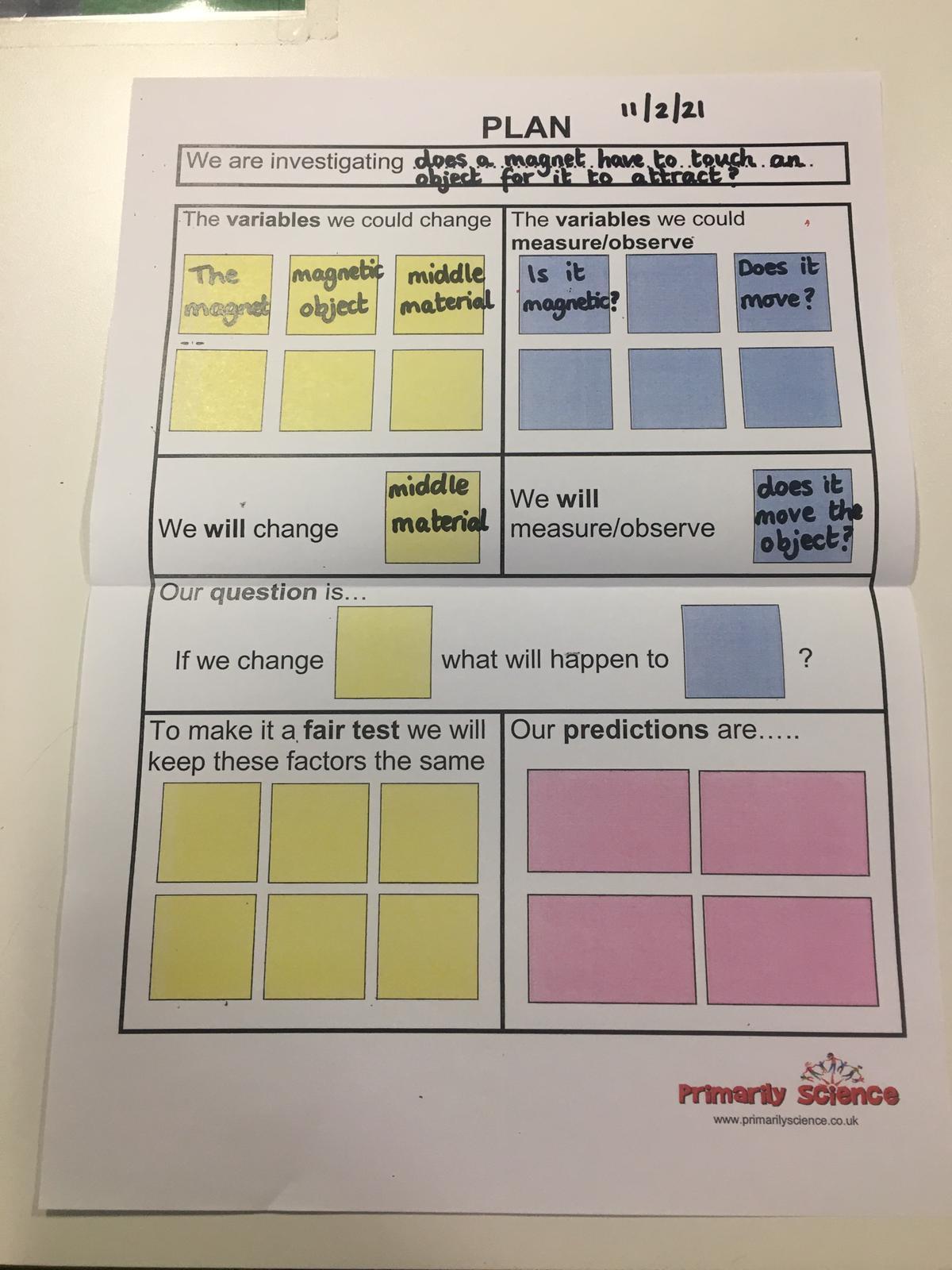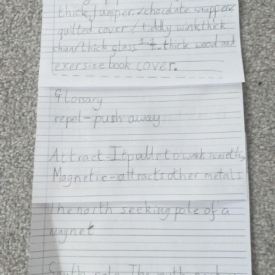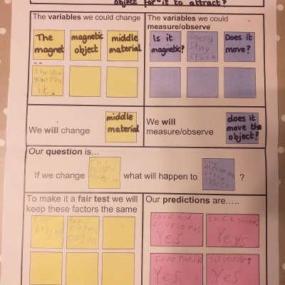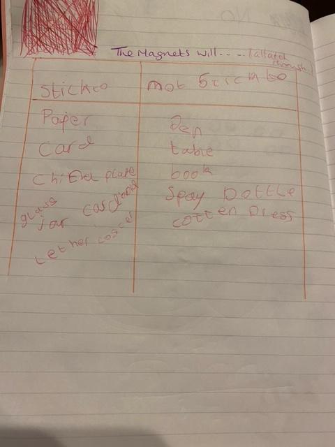 This afternoon we would like you to complete the science investigation from last week. Looking at 'can a magnet still attract and object through a variety of materials?' I know a few of you got a little confused with the sheet last week so don't worry about that. Today all we would like to see is your predictions and the results. Remember to keep it a fair test we should only be changing one thing (in this case the middle material). So you should use the same magnet for each material and the same small magnetic object.