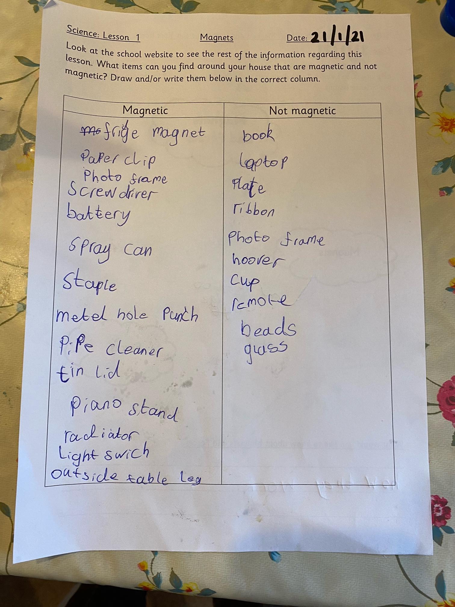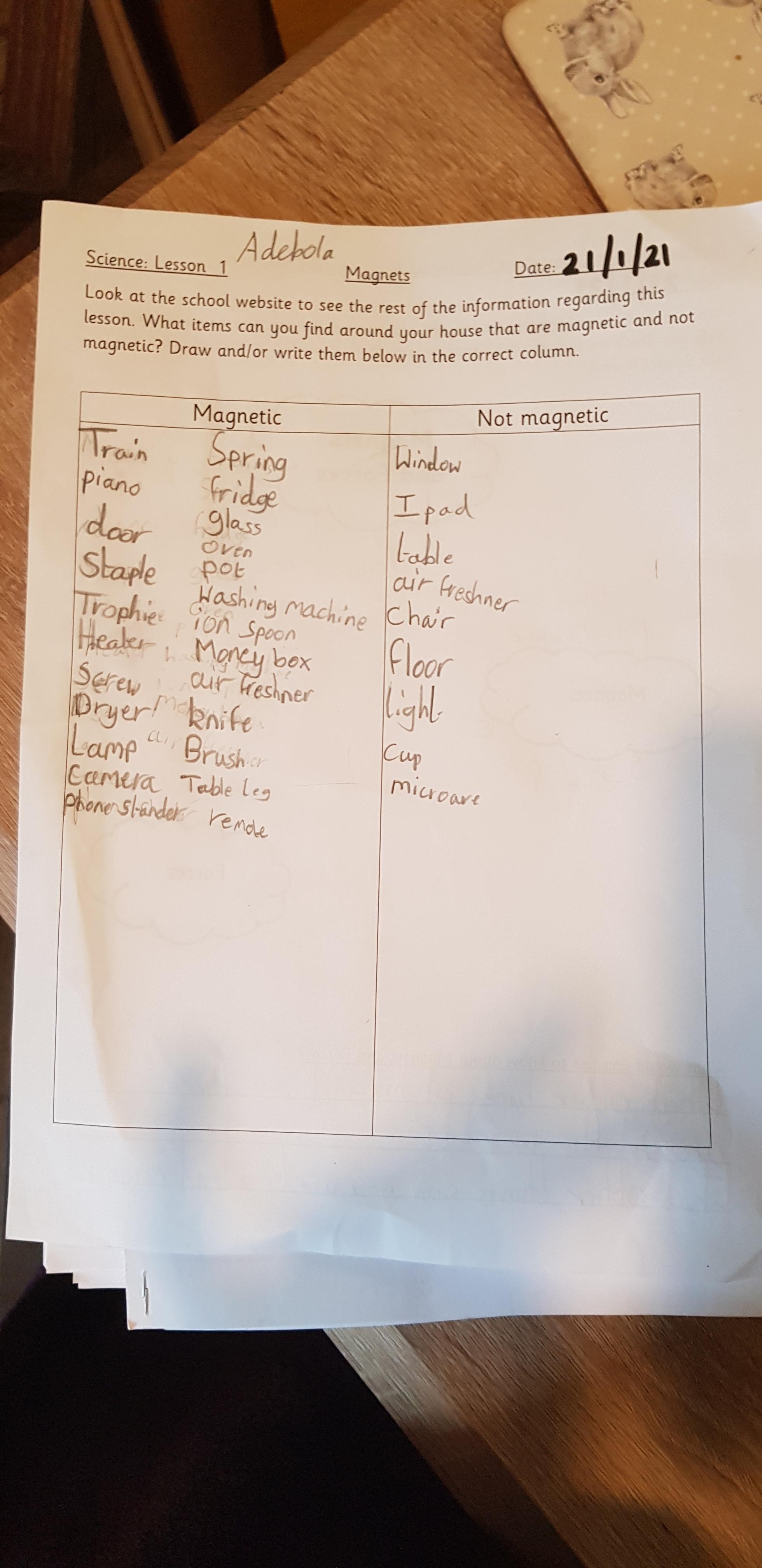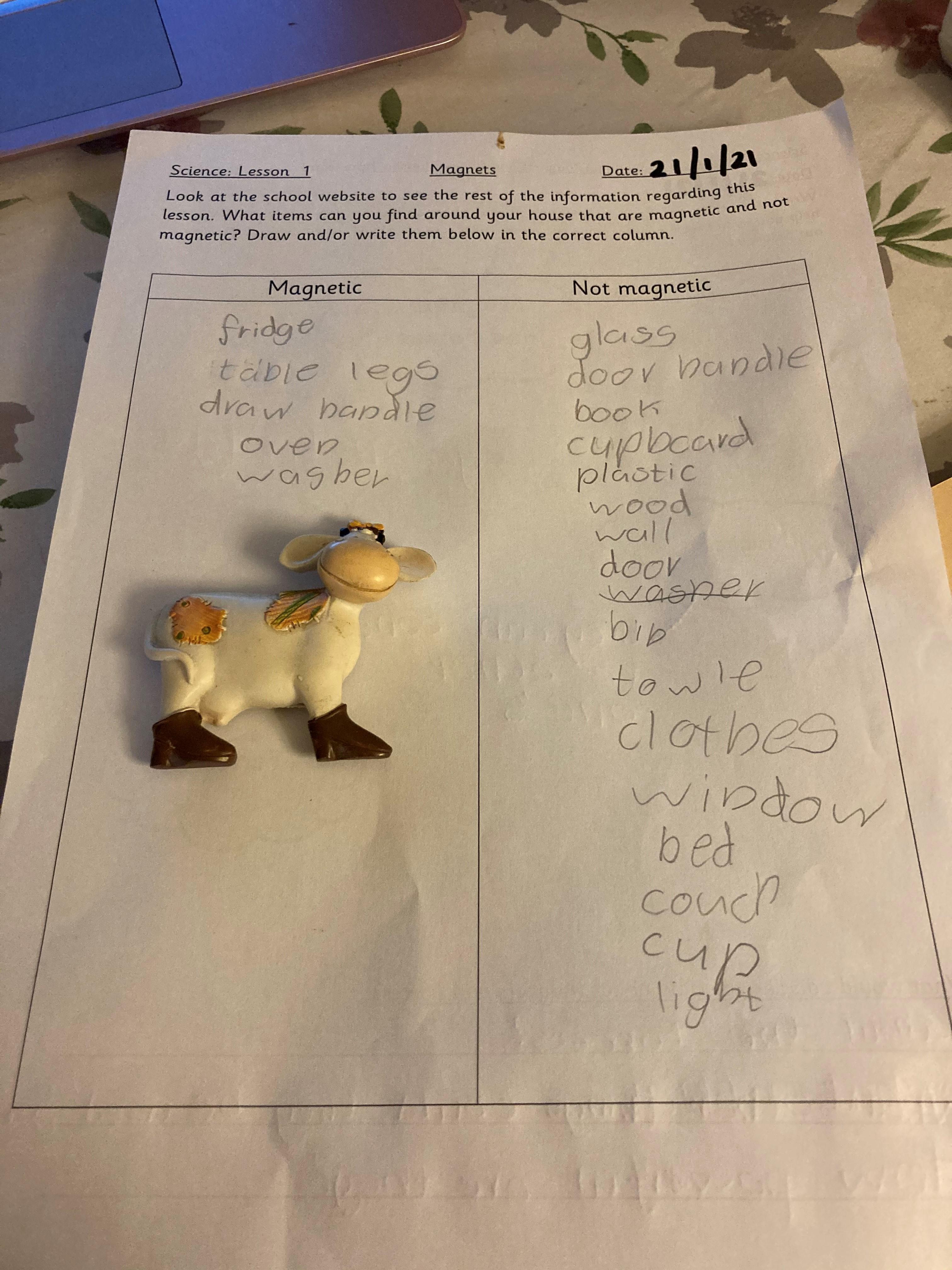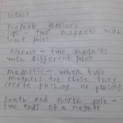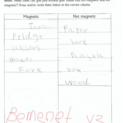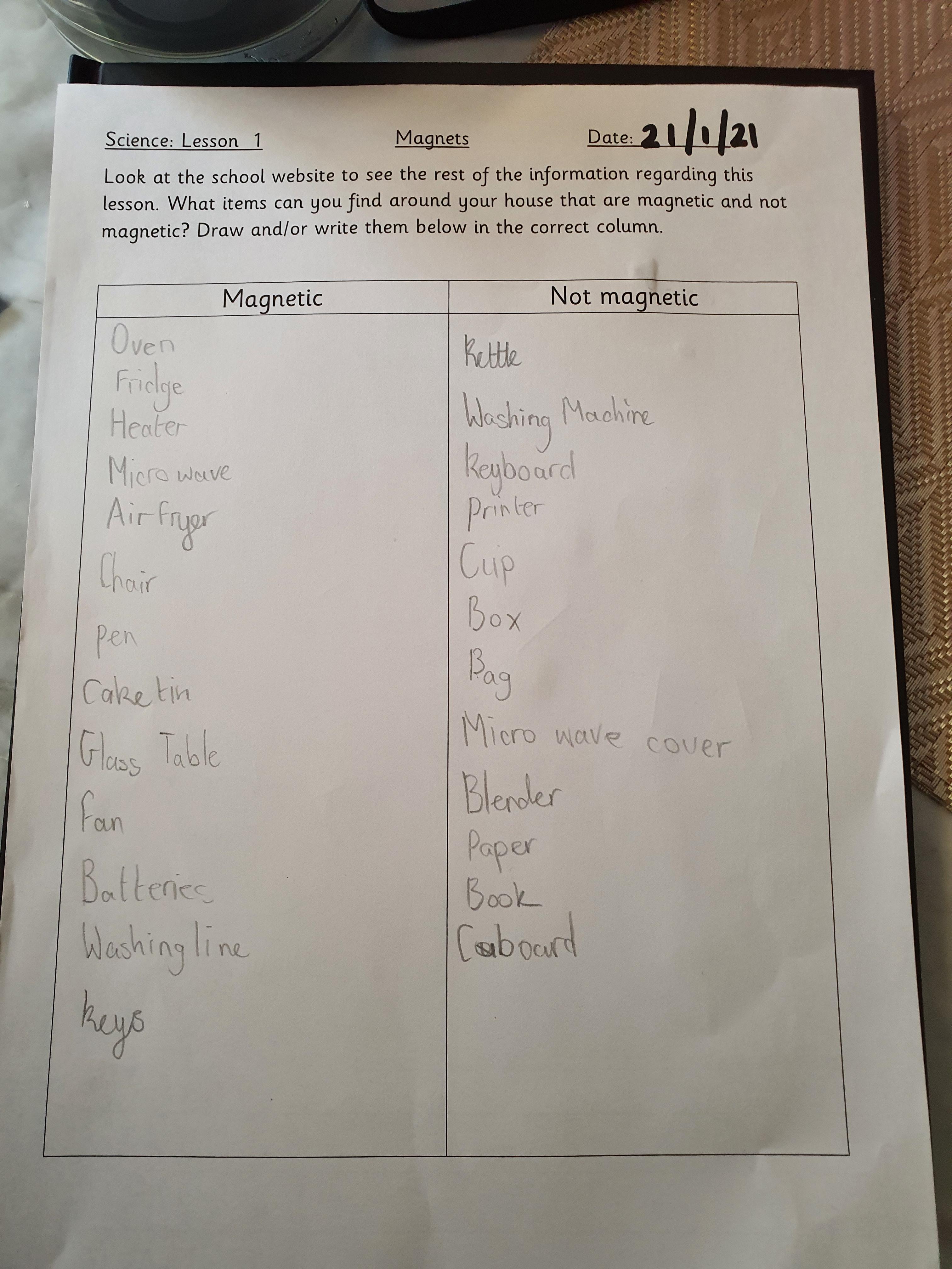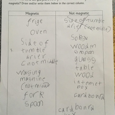 This afternoon we would like you to complete the science investigation from last week. Looking at 'can a magnet still attract and object through a variety of materials?' I know a few of you got a little confused with the sheet last week so don't worry about that. Today all we would like to see is your predictions and the results. Remember to keep it a fair test we should only be changing one thing (in this case the middle material). So you should use the same magnet for each material and the same small magnetic object.