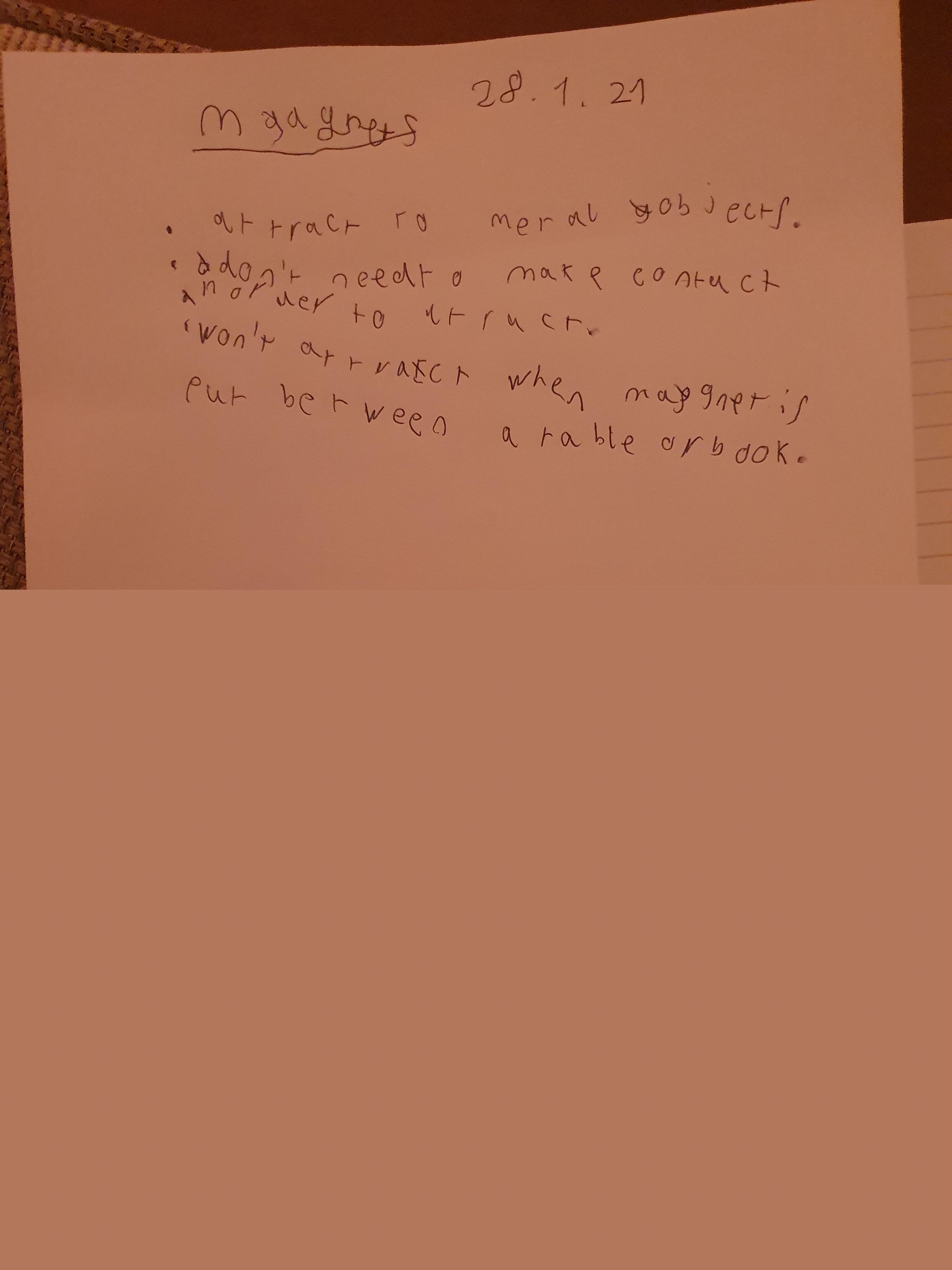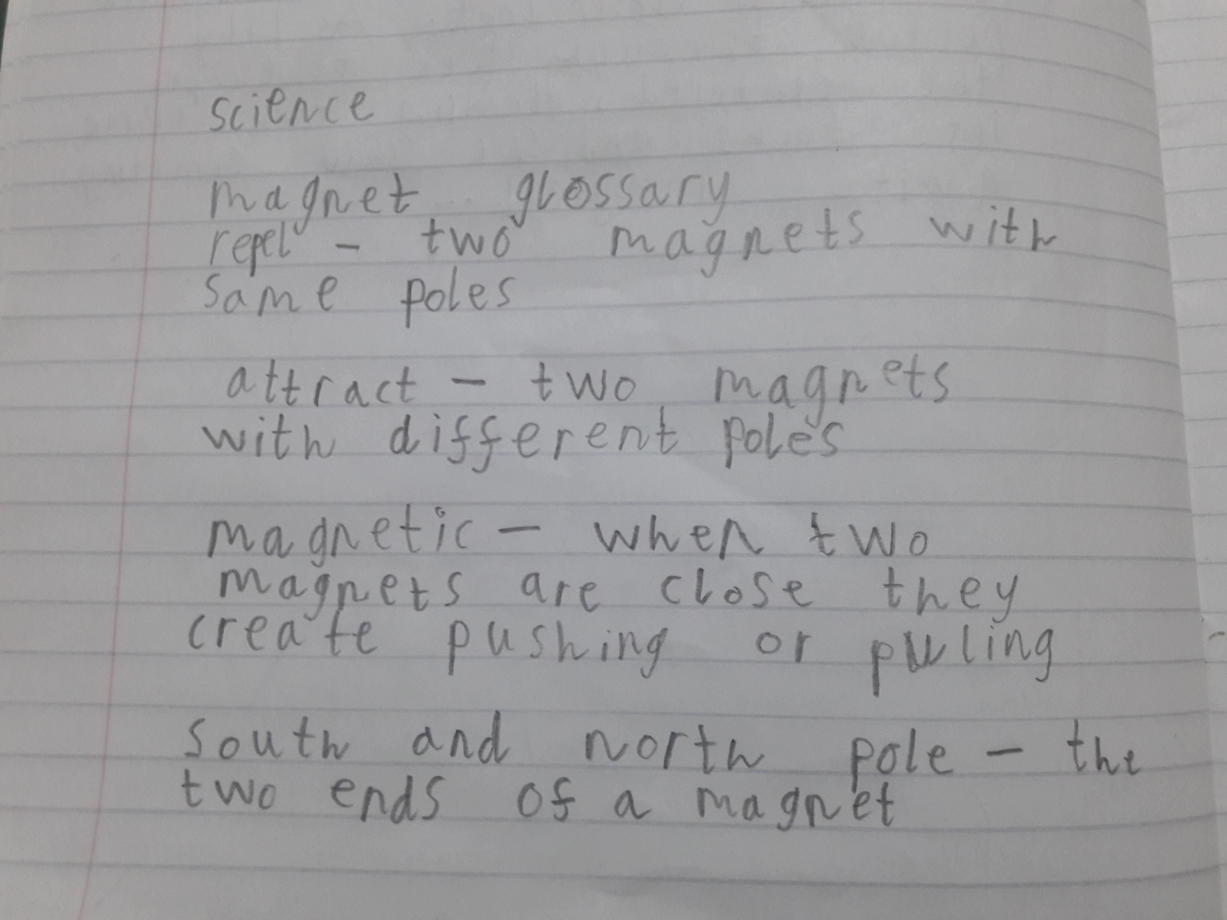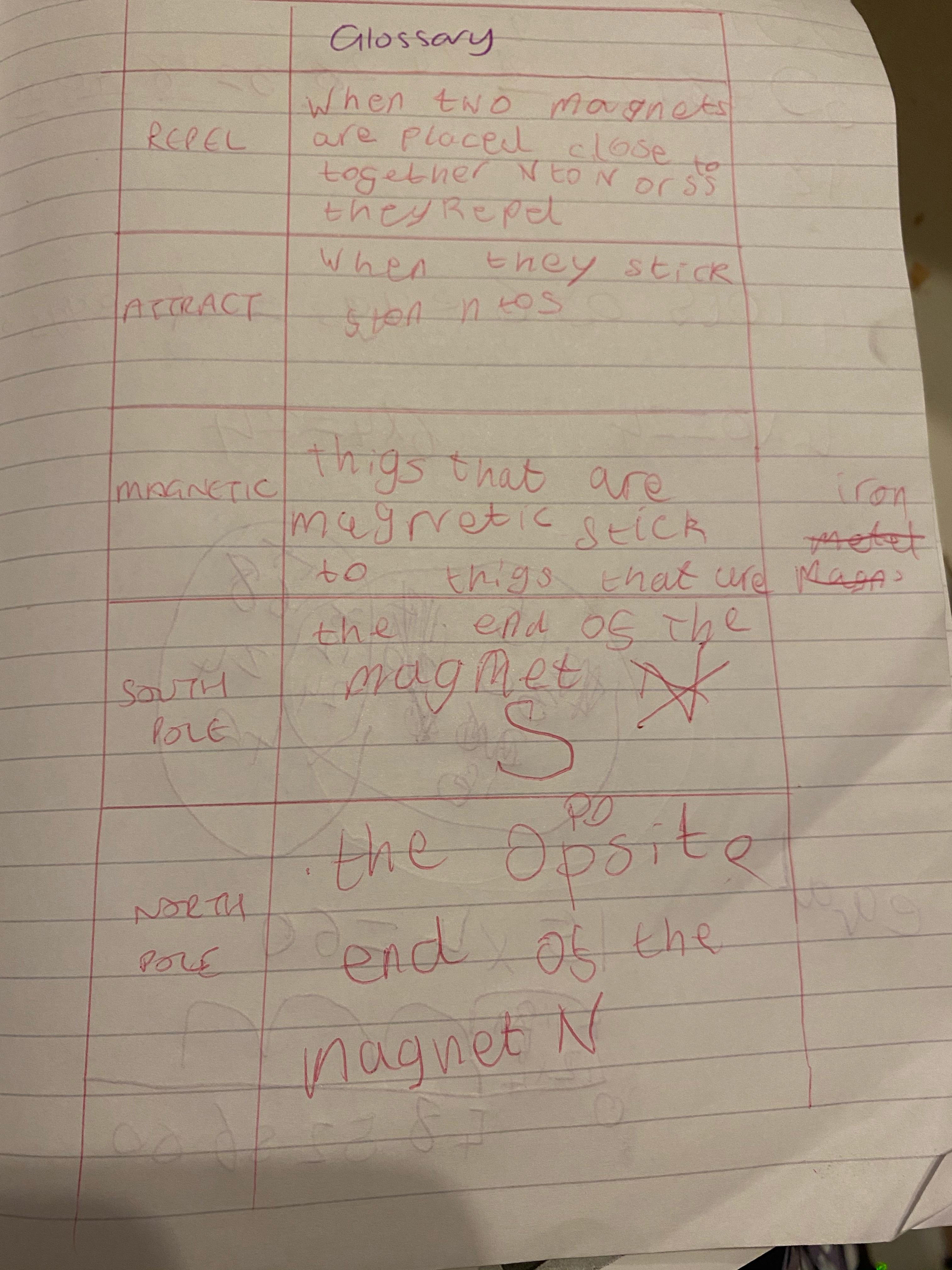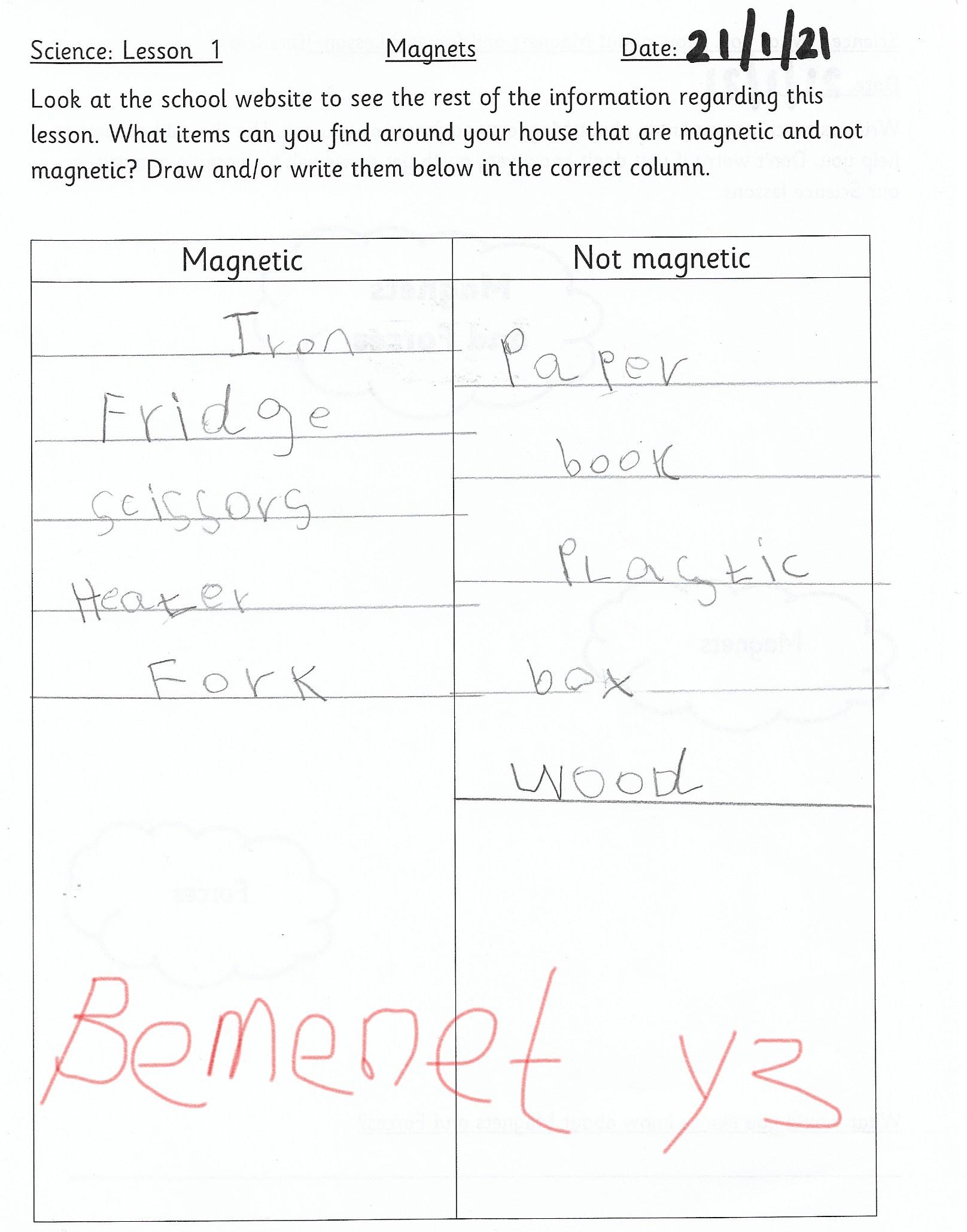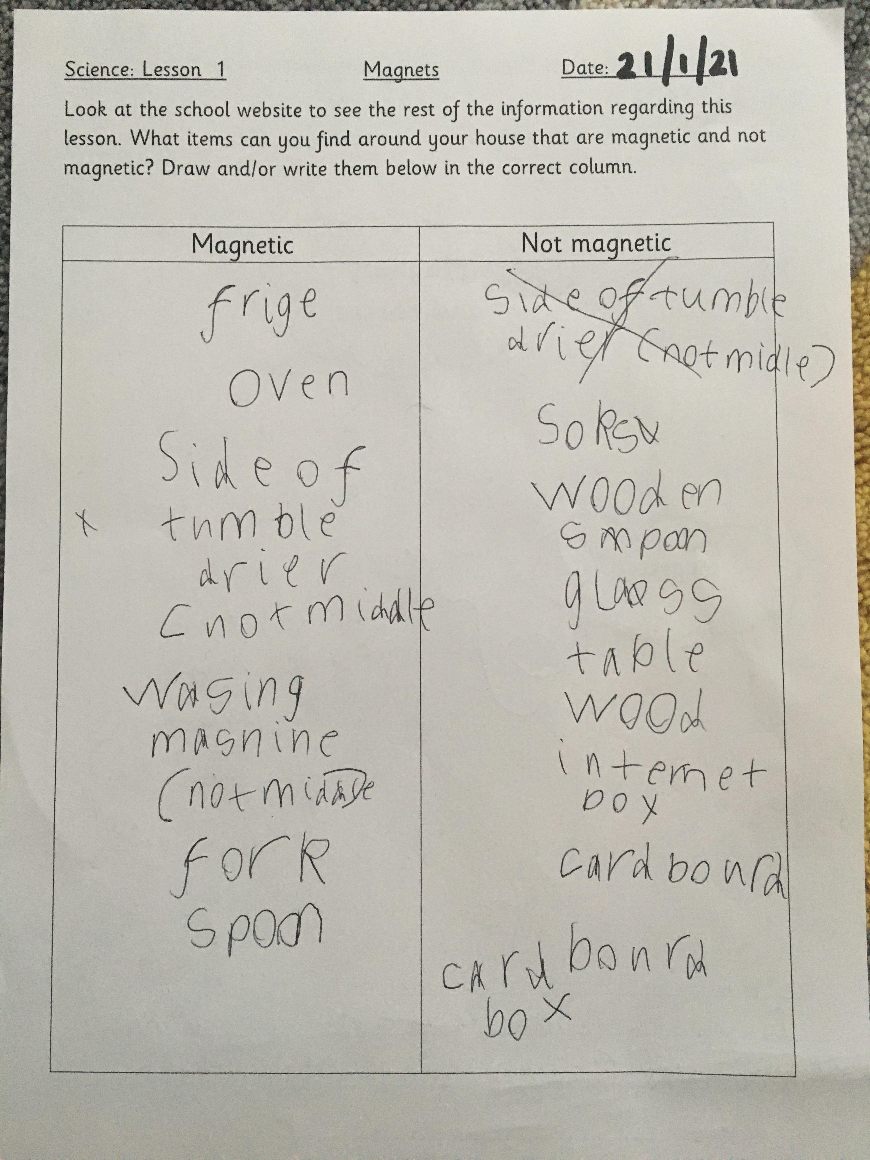 This afternoon we would like you to complete the science investigation from last week. Looking at 'can a magnet still attract and object through a variety of materials?' I know a few of you got a little confused with the sheet last week so don't worry about that. Today all we would like to see is your predictions and the results. Remember to keep it a fair test we should only be changing one thing (in this case the middle material). So you should use the same magnet for each material and the same small magnetic object.