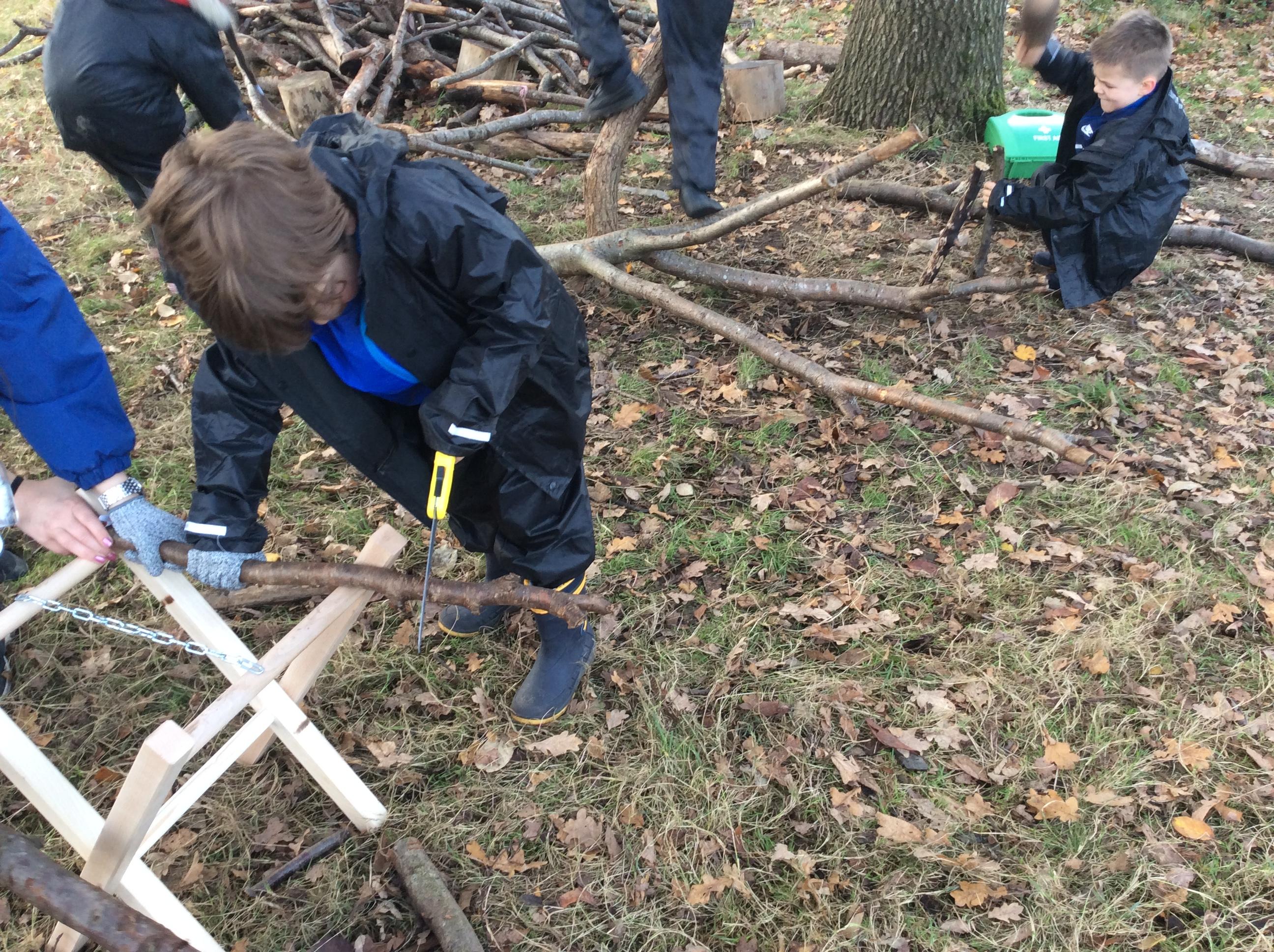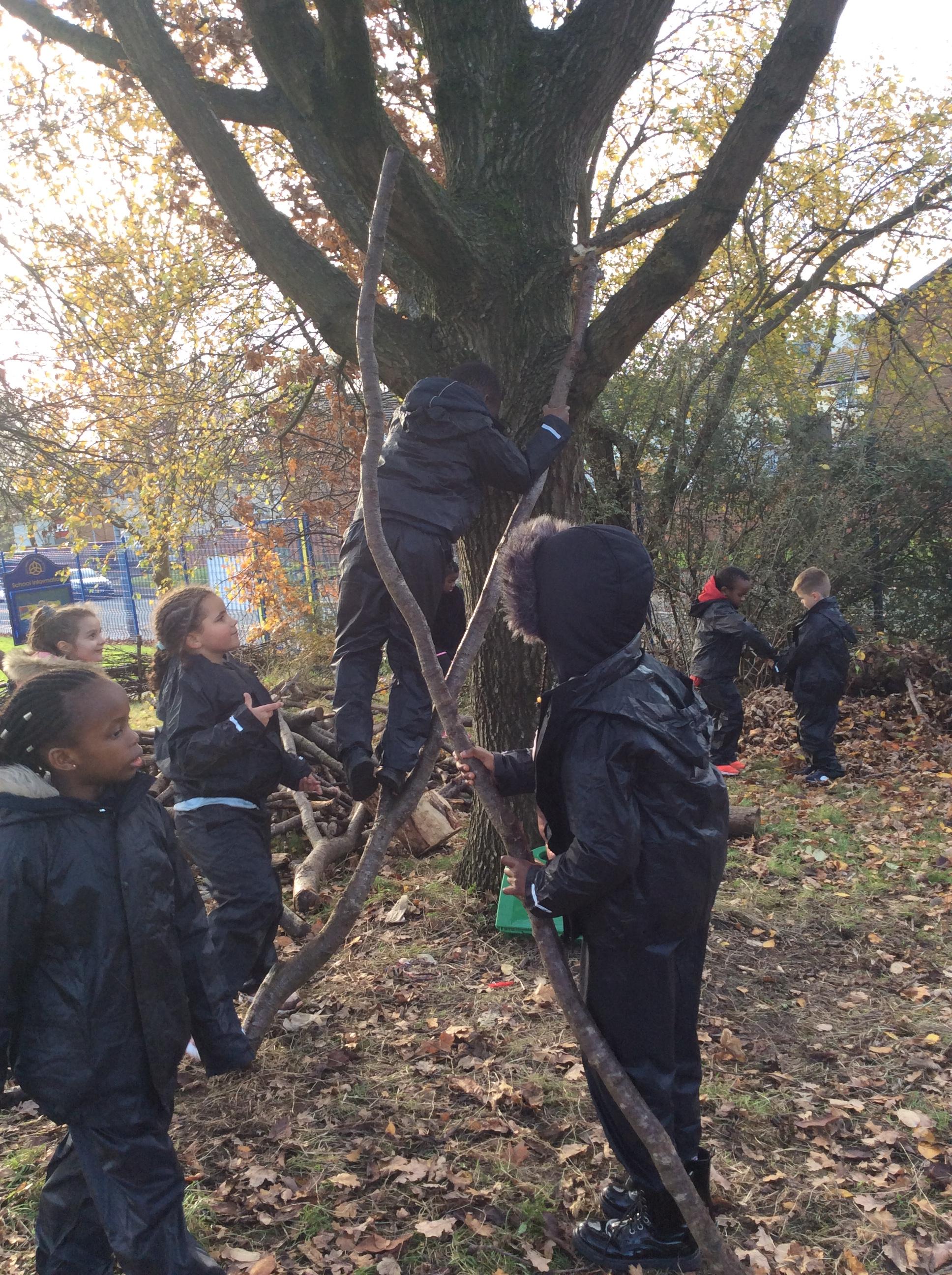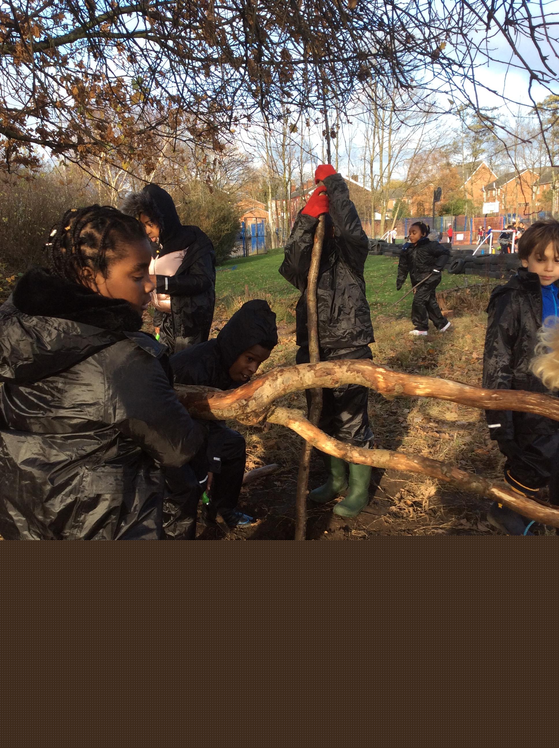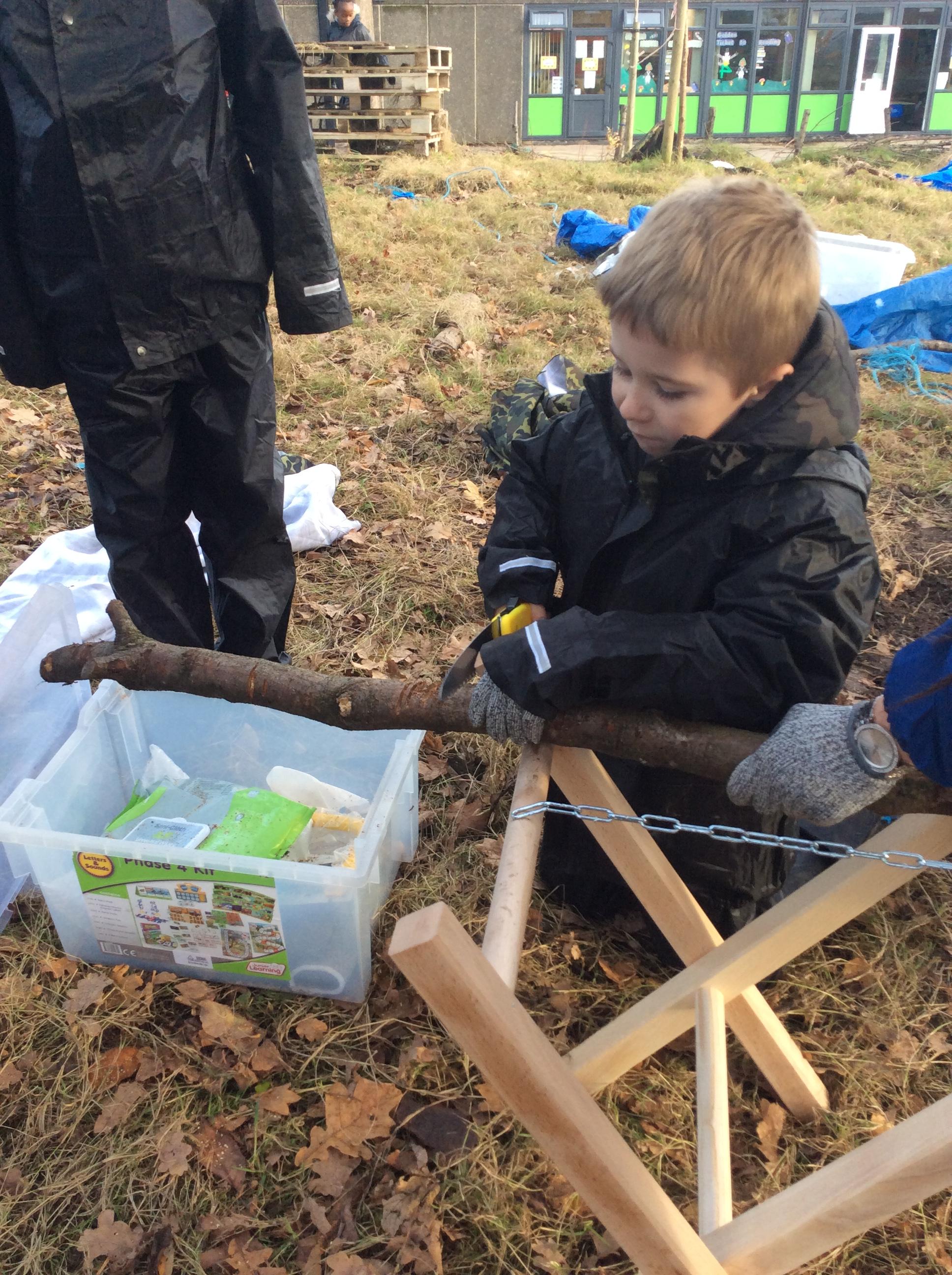 This week we had our first Forest School session outside in the Forest School area (in between the 2 playgrounds). We had a great time and already started developing a range of skills. We had to investigate, adapt and explore the area and how we could use the resources. We also had to develop our team work skills and physical skills. We climbed trees, built shelters, made dens in the bushes and a few us even got chance to use the saw.