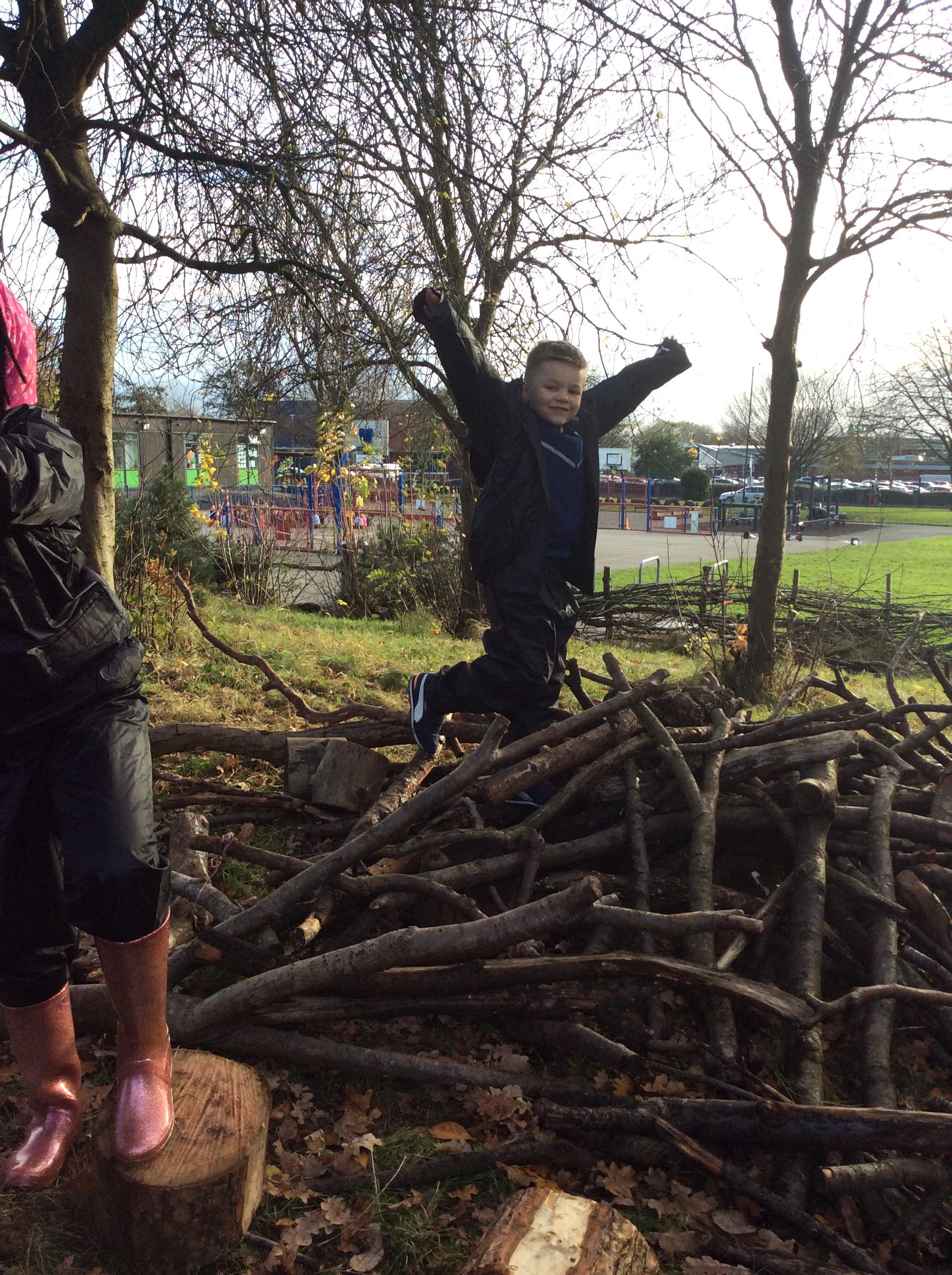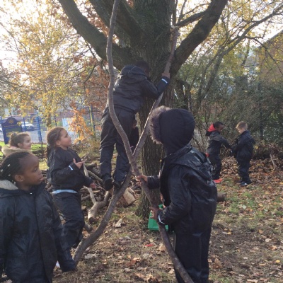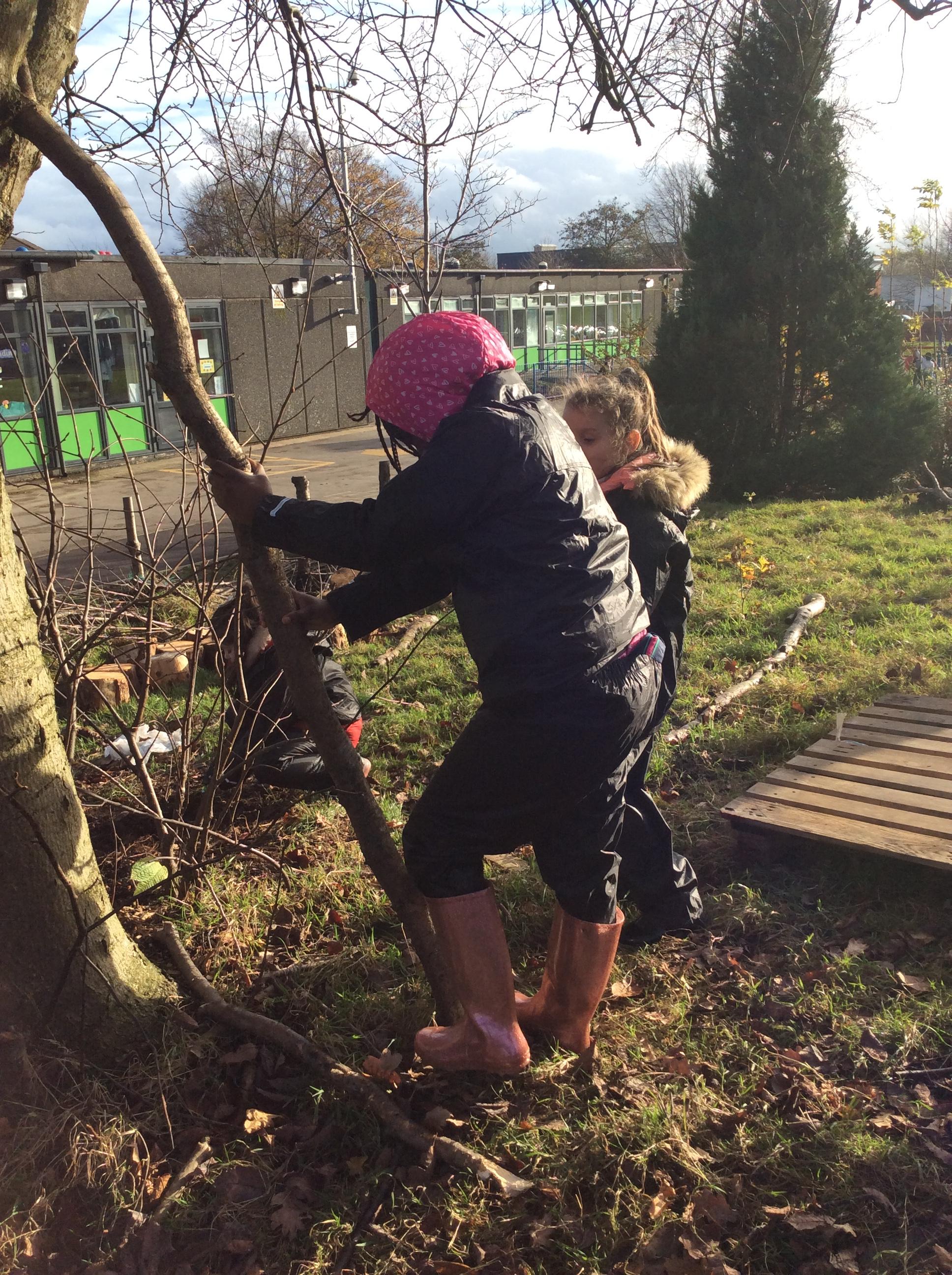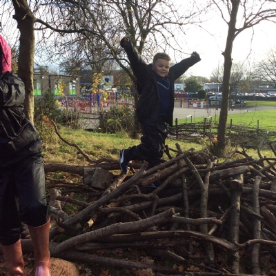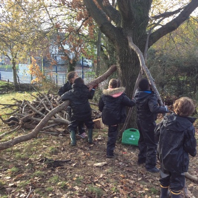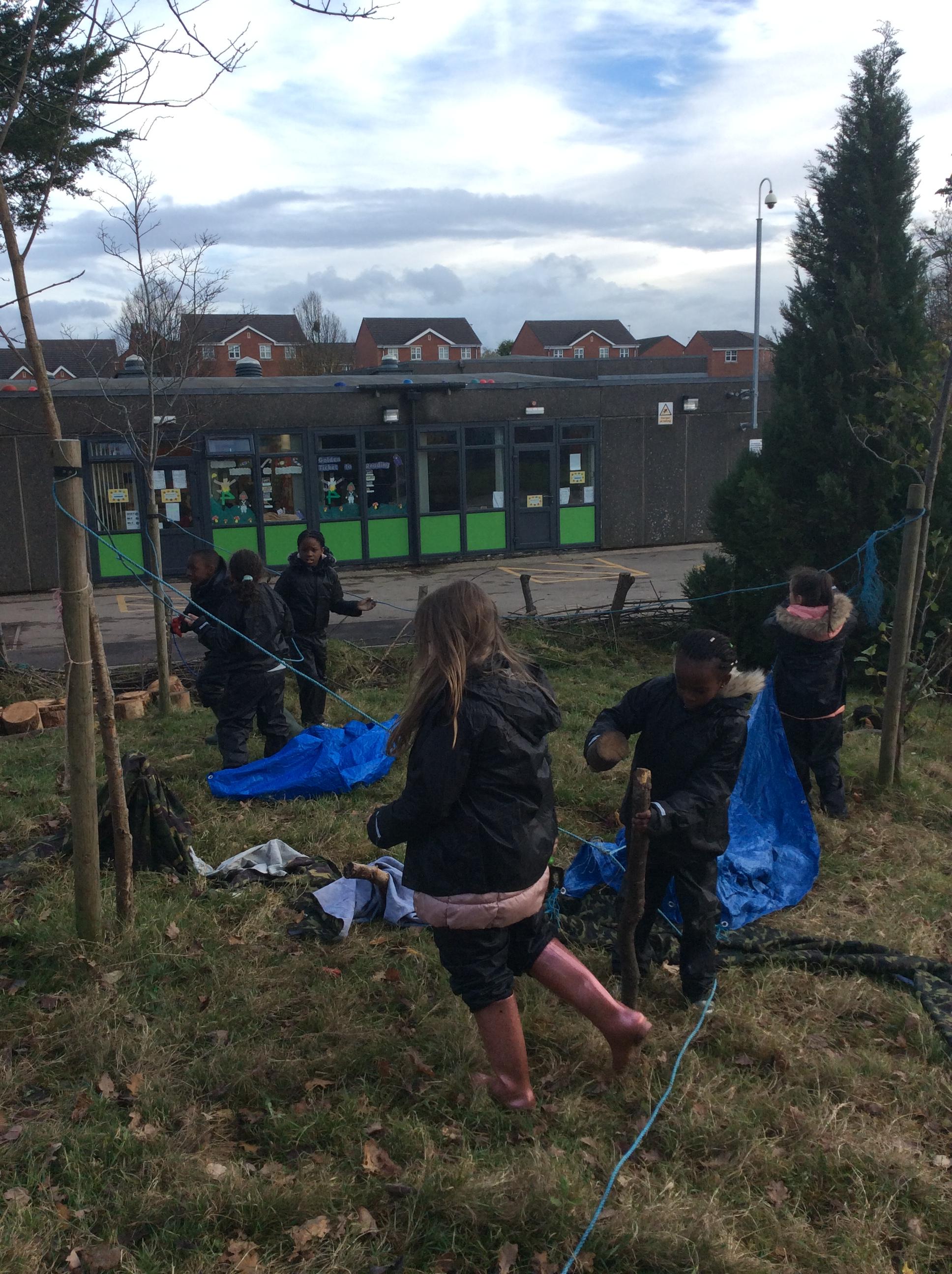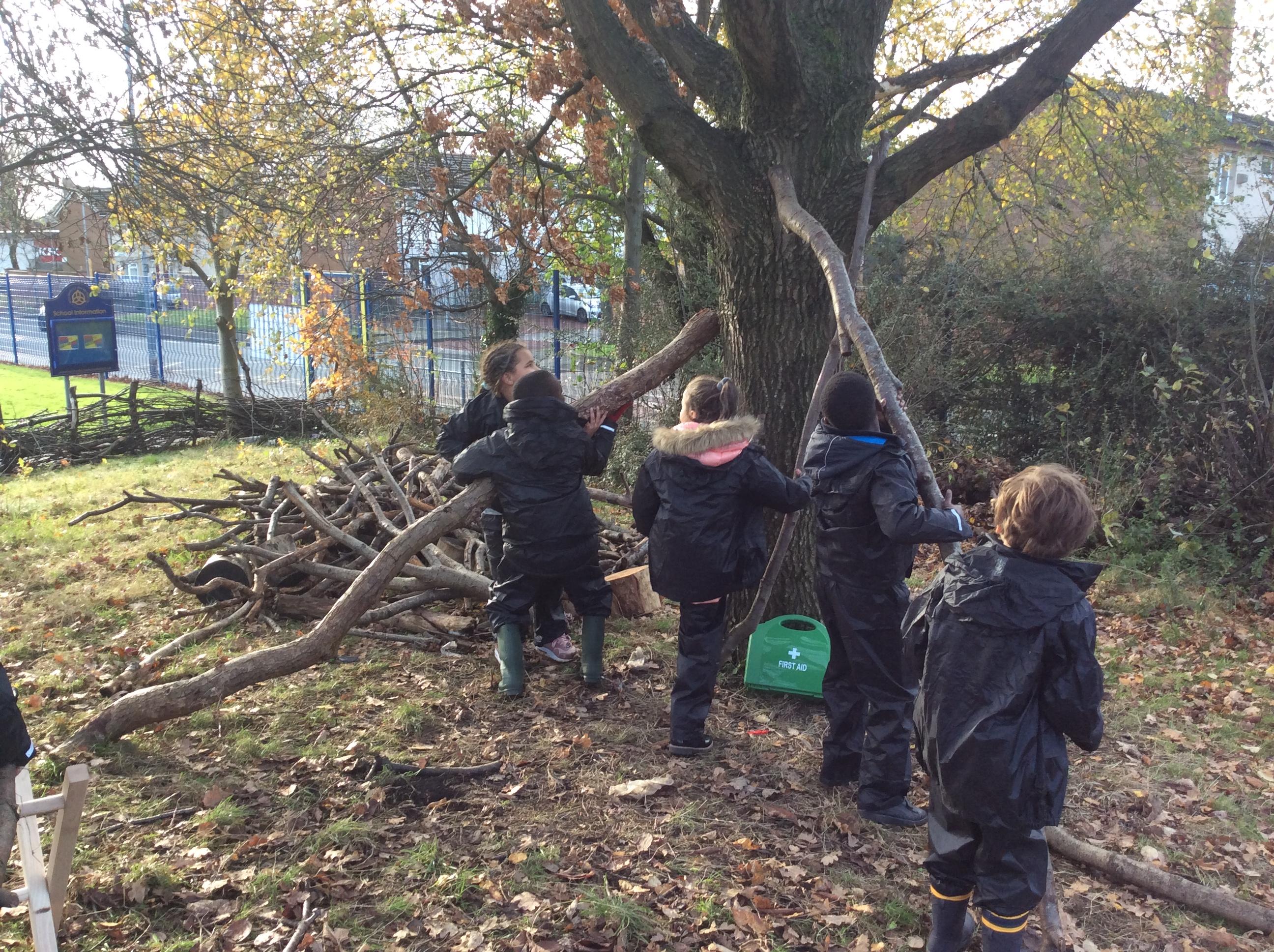 This week we had our first Forest School session outside in the Forest School area (in between the 2 playgrounds). We had a great time and already started developing a range of skills. We had to investigate, adapt and explore the area and how we could use the resources. We also had to develop our team work skills and physical skills. We climbed trees, built shelters, made dens in the bushes and a few us even got chance to use the saw.