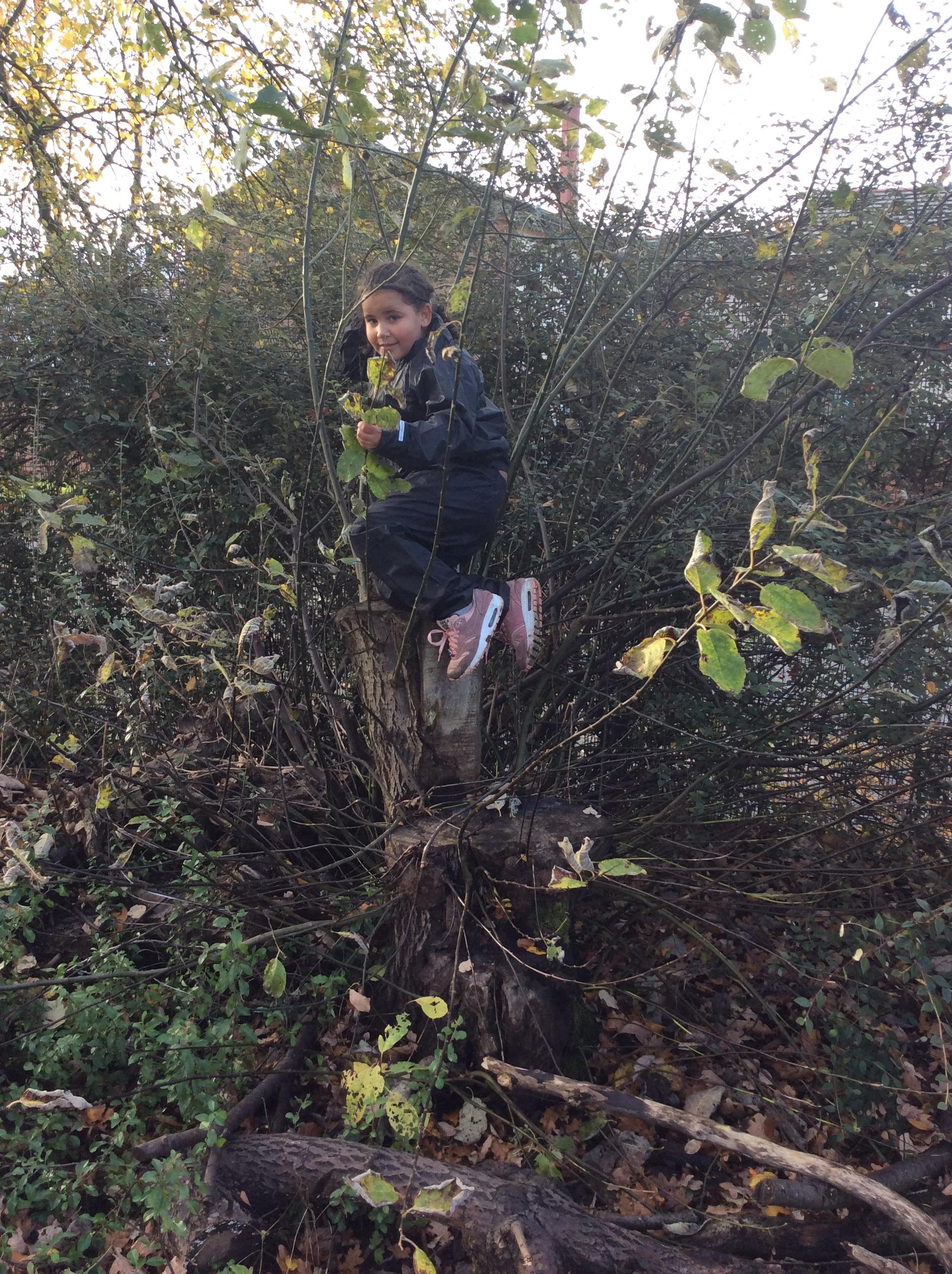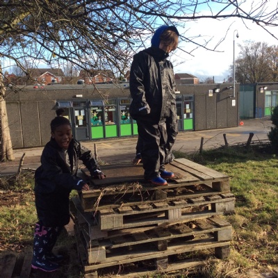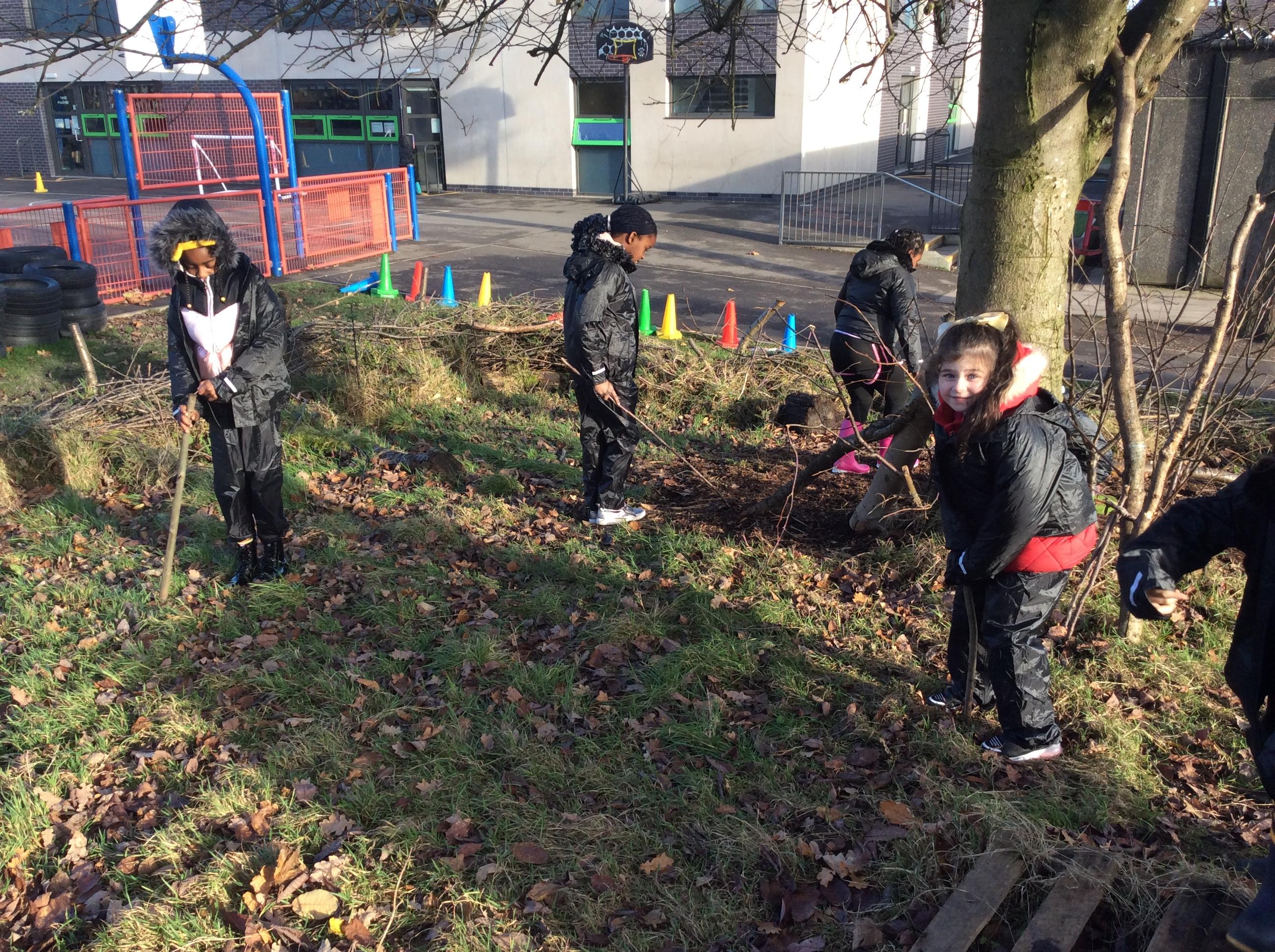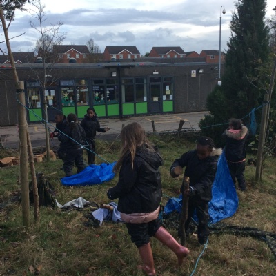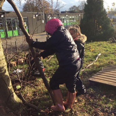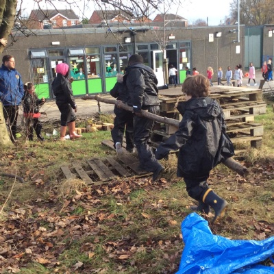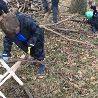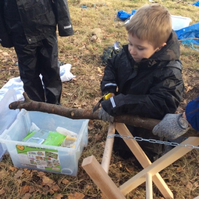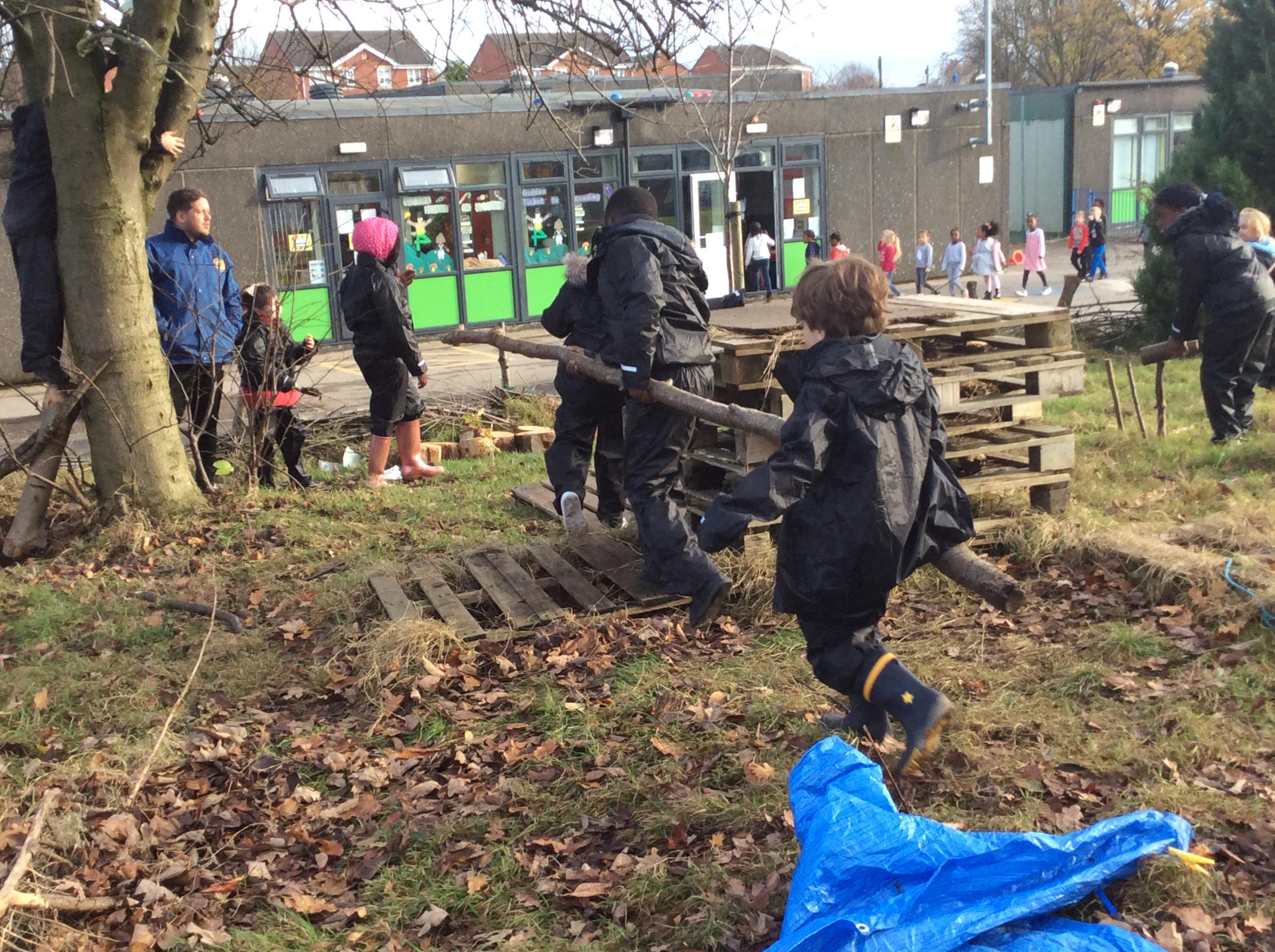 This week we had our first Forest School session outside in the Forest School area (in between the 2 playgrounds). We had a great time and already started developing a range of skills. We had to investigate, adapt and explore the area and how we could use the resources. We also had to develop our team work skills and physical skills. We climbed trees, built shelters, made dens in the bushes and a few us even got chance to use the saw.